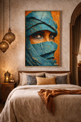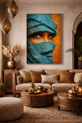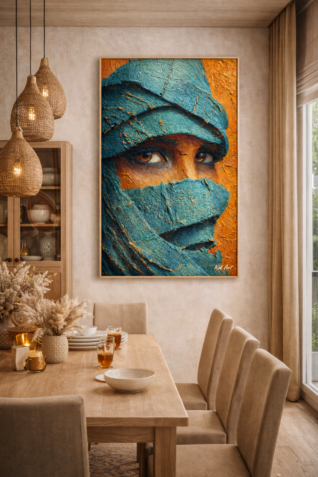Un regard intense, sculpté par la matière et le silence du désert.Cette Å“uvre capture la force intérieure et la dignité intemporelle du Tassili, entre pigments bruts et profondeur émotionnelle. Regard du Tassili est une Å“uvre numérique à l’esthétique picturale forte, inspirée des visages sahariens et de la puissance symbolique du désert algérien.Le regard, partiellement voilé, semble traverser le temps. Il raconte la résilience, la mémoire et la beauté silencieuse des terres du Sud. Les textures épaisses, presque sculptées, rappellent la peinture à l’huile et donnent à cette création une présence physique rare, même en version numérique. Les contrastes entre les bleus profonds et les ocres chauds évoquent le dialogue éternel entre l’ombre et la lumière, entre l’homme et le désert. Cette Å“uvre a été pensée comme une pièce de caractère, capable de transformer un espace intérieur en lieu de contemplation.€1.00